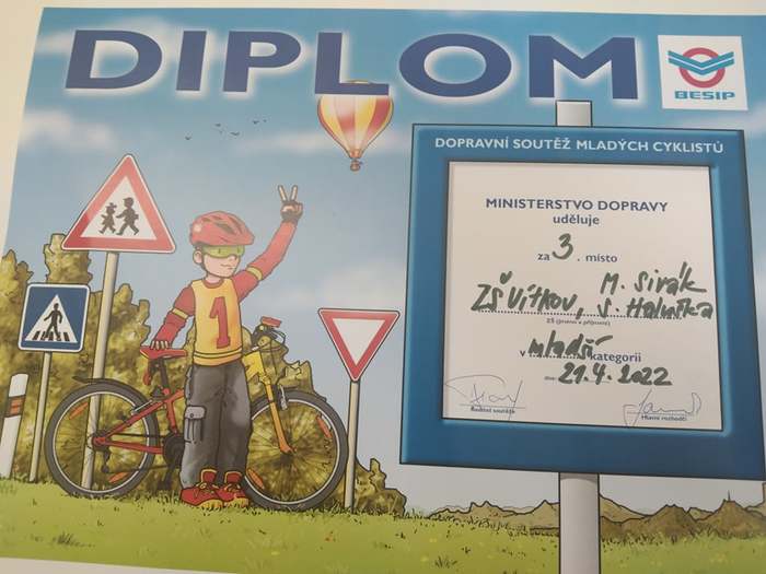 Školní dopravní soutěžení je za námi, a tak se pan učitel Kunčík vypravil se žáky na okresní dopravní soutěž. Akce se uskutečnila v areálu ZŠ Slezského Odboje. Je vždy výborně zorganizována a žáky velice baví. Zasoutěžili si ve třech disciplínách: dovednostní jízda, pravidla silničního provozu a zdravověda, a dosáhli skvělého úspěchu! V kategorii mladších cyklistů, za které soutěžili Simon H. a Martin S., získali třetí místo. Simon dokonce získal z našich žáků nejvíce bodů - gratulujeme!