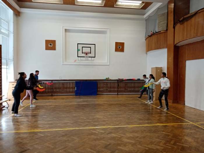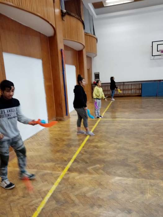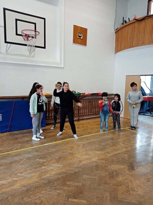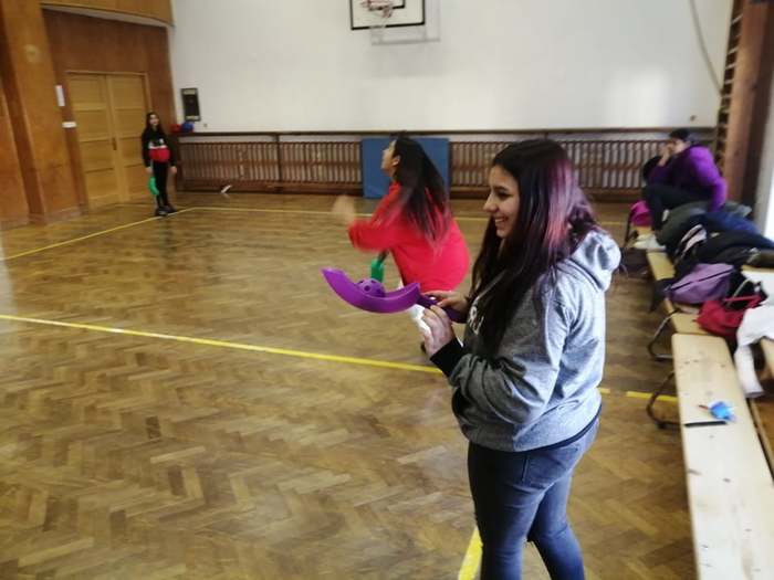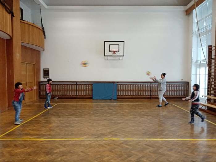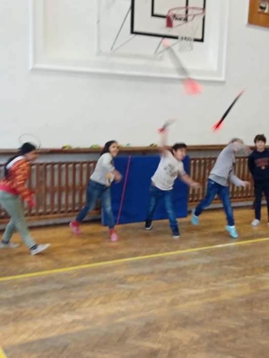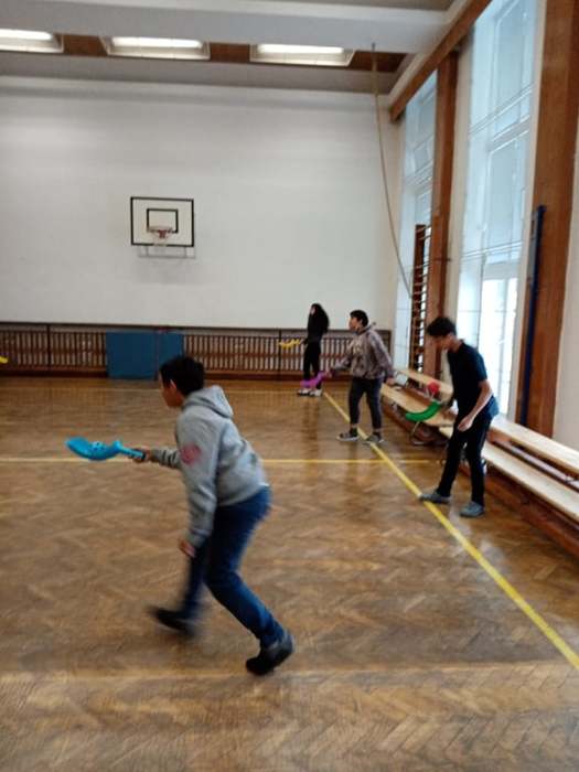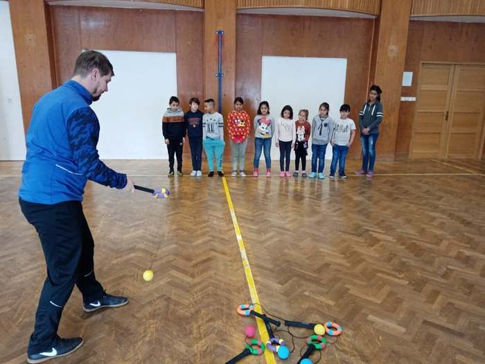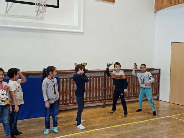 Proto pan učitel Kunčík a paní asistentka Frydryšková uspořádali v prvním prosincovém týdnu několikrát, vždy o přestávce, malou prezentaci zajímavých pomůcek pro pohybové aktivity, které škola nakoupila. Kdo tedy chtěl, mohl si užít házení s létajícími raketkami, s plastovými oštěpy, vyzkoušet si chytání míčku do pohárku, přihrávky plným míčem a jiné zajímavé aktivity.