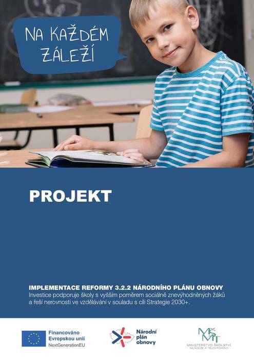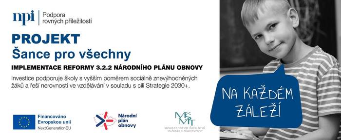 Od 1.9.2022 je škola zařazena do Implementace reformy 3.2.2 NPO. V rámci projektu s názvem Šance pro všechny budou realizovány mnohé akce a aktivity se zaměřením např. na zvyšování studijní motivace, adaptační a socializační aktivity, zážitkové vzdělávací programy i akce se zaměřením na posílení spolupráce s rodiči sociálně znevýhodněných žáků. Novou aktivitou realizovanou v projektu jsou snídaňové kluby pro děti, jejichž cílem je nejen podpořit zdravé stravování nejmenších, ale také posílit vztahy mezi dětmi a pedagogy při neformálních aktivitách. Projektem bude podpořeno také DVPP pedagogů a doučování žáků. Hrazeny budou dvě nové pracovní pozice - pozice sociálního pedagoga a asistenta pedagoga.